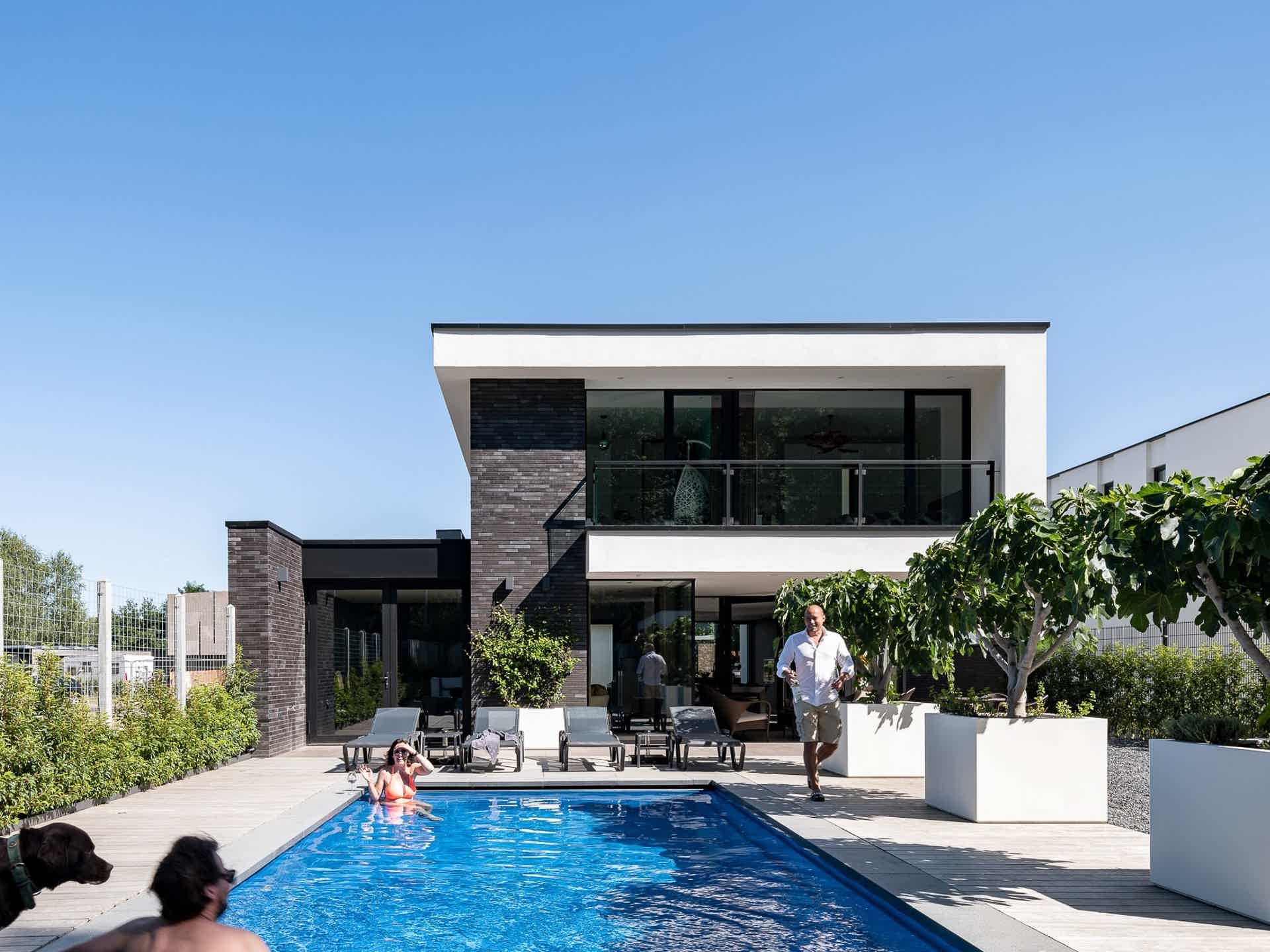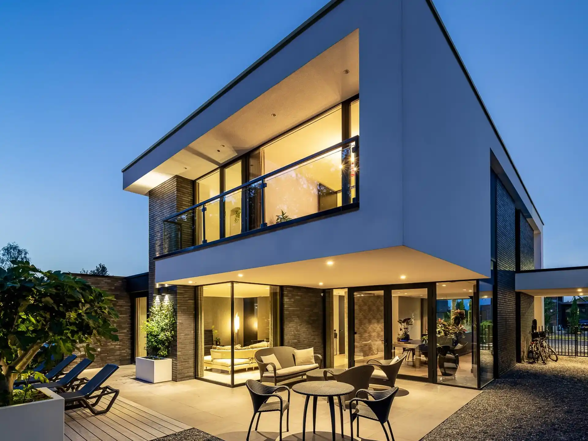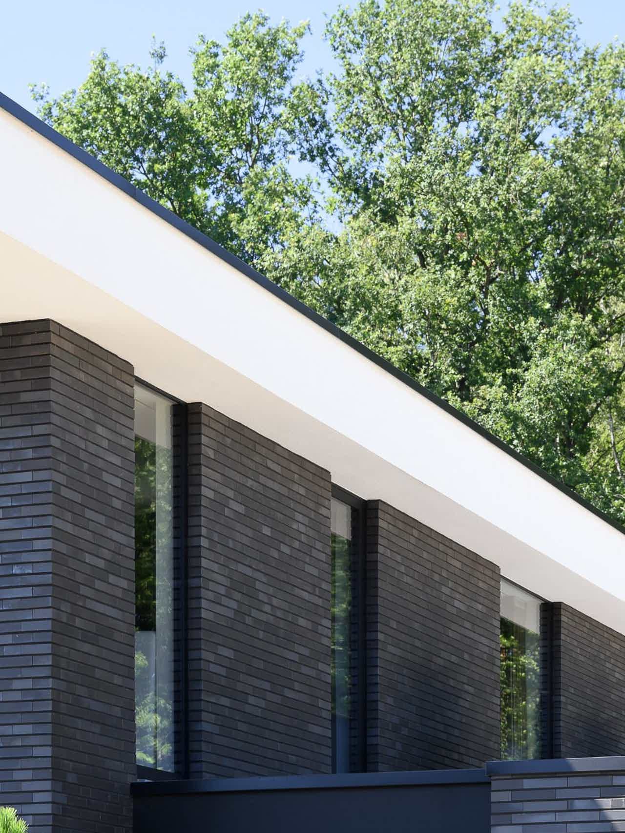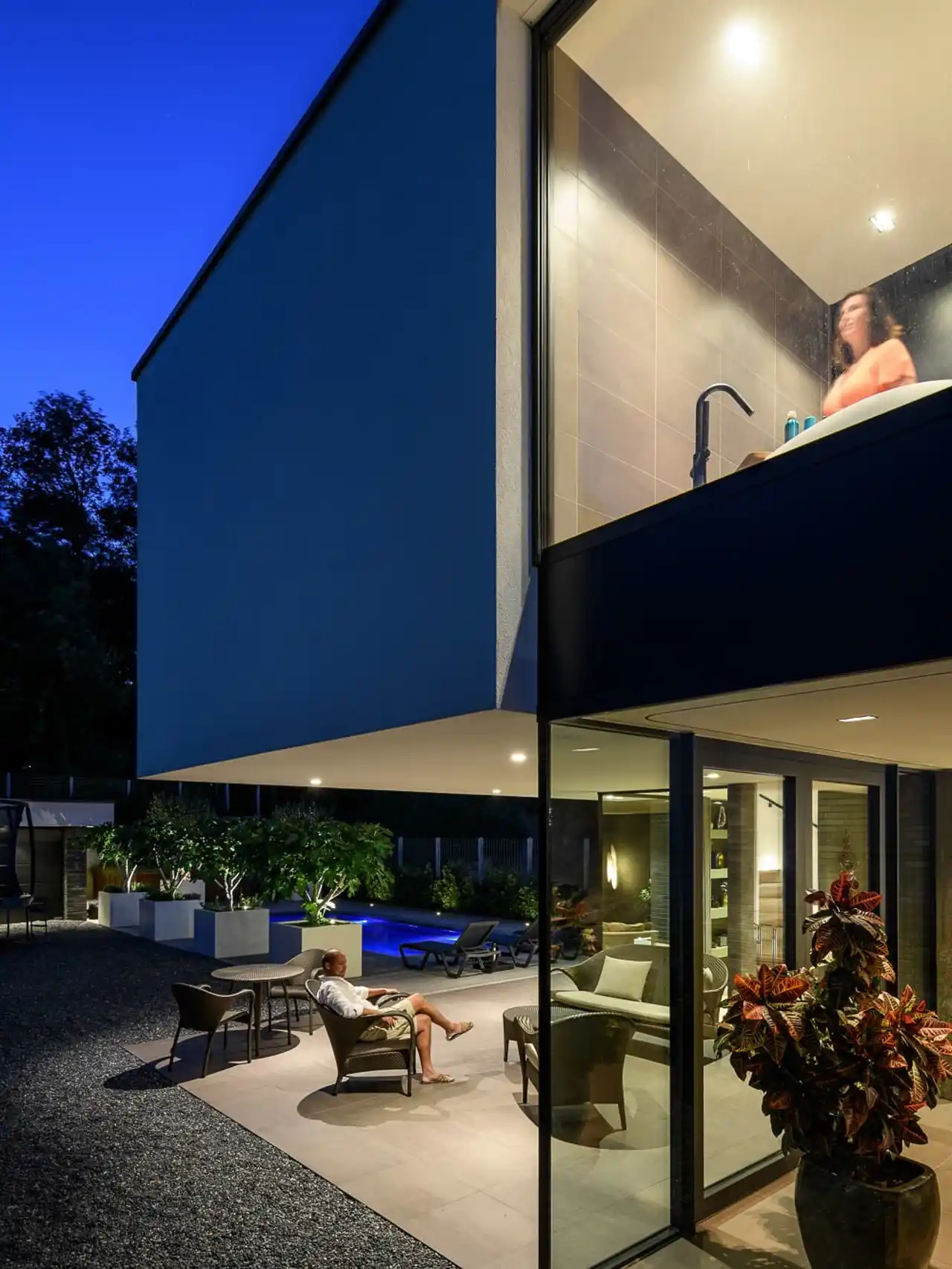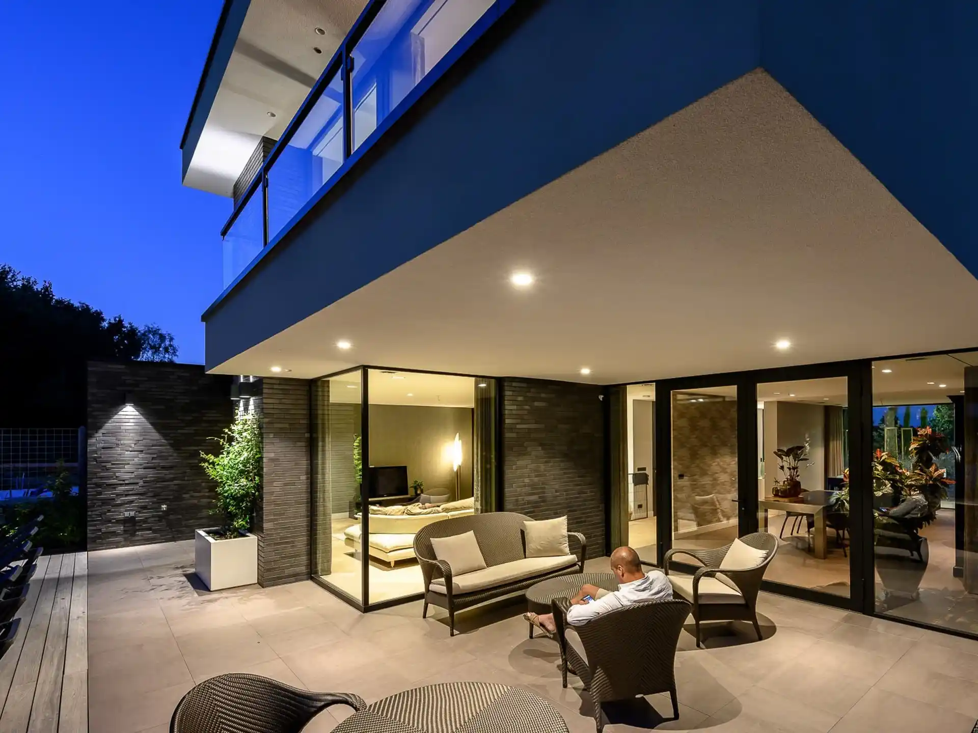 De overkragende bovenbouw geeft een overweldigende indruk van de combinatie tussen moderne architectuur en staalframe op zijn best. Deze vormt de perfecte overdekking vanuit de binnenruimte de tuin in. De ideale plek om in alle rust buiten te leven.
