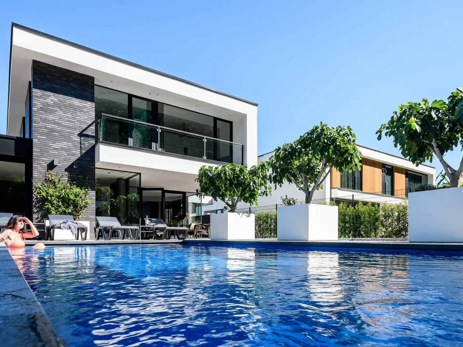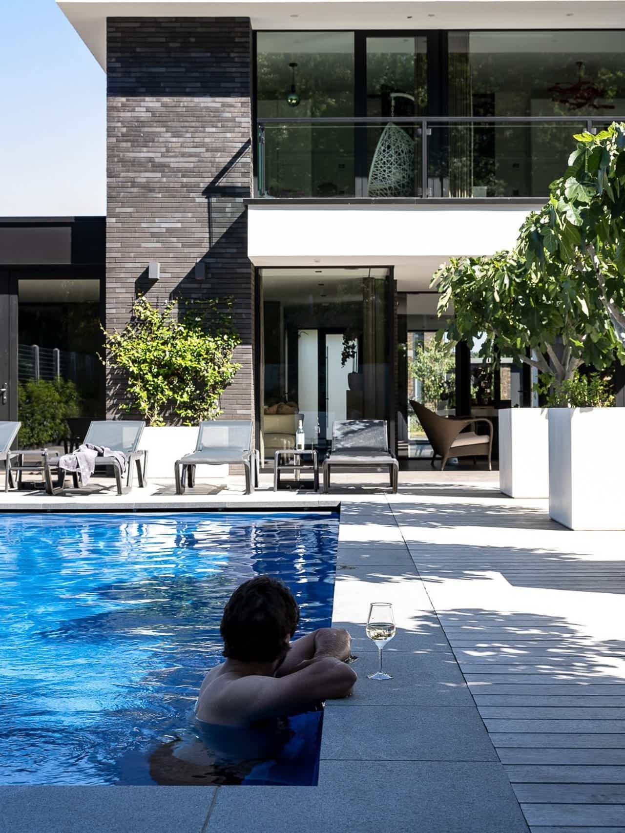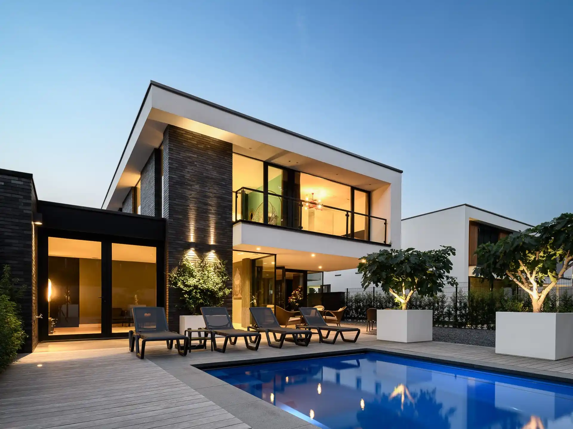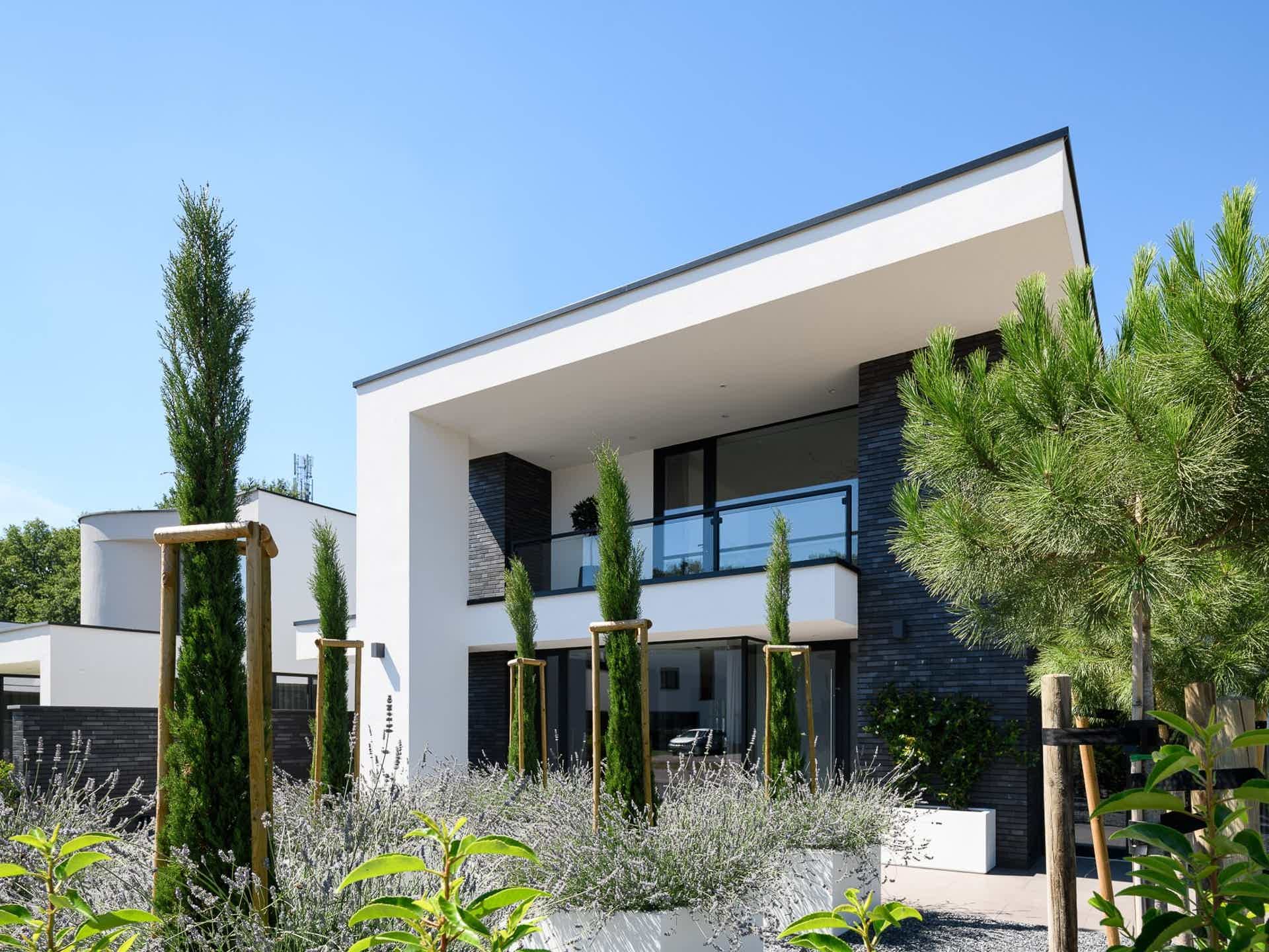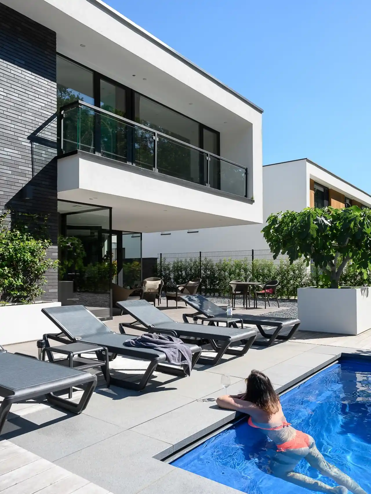De overkragende bovenbouw geeft een overweldigende indruk van de combinatie tussen moderne architectuur en staalframe op zijn best. Deze vormt de perfecte overdekking vanuit de binnenruimte de tuin in. De ideale plek om in alle rust buiten te leven.